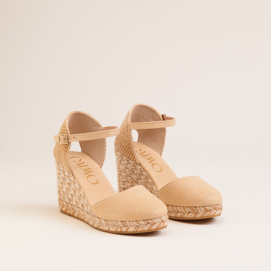 Alpargata de mujer Gaimo en algodón. Modelo Colin de corte cerrado y talonera con cierre mediante hebilla al tobillo. Plantillas acolchadas y cuña de yute ecológico de 9 cm de altura y plataforma de 1,6 cm. Diseñadas y fabricadas artesanalmente en España, nuestro modelo icónico, atemporal, reinterpretado en nuevos colores que será un fondo de armario muy cómodo e ideal para cualquier ocasión.