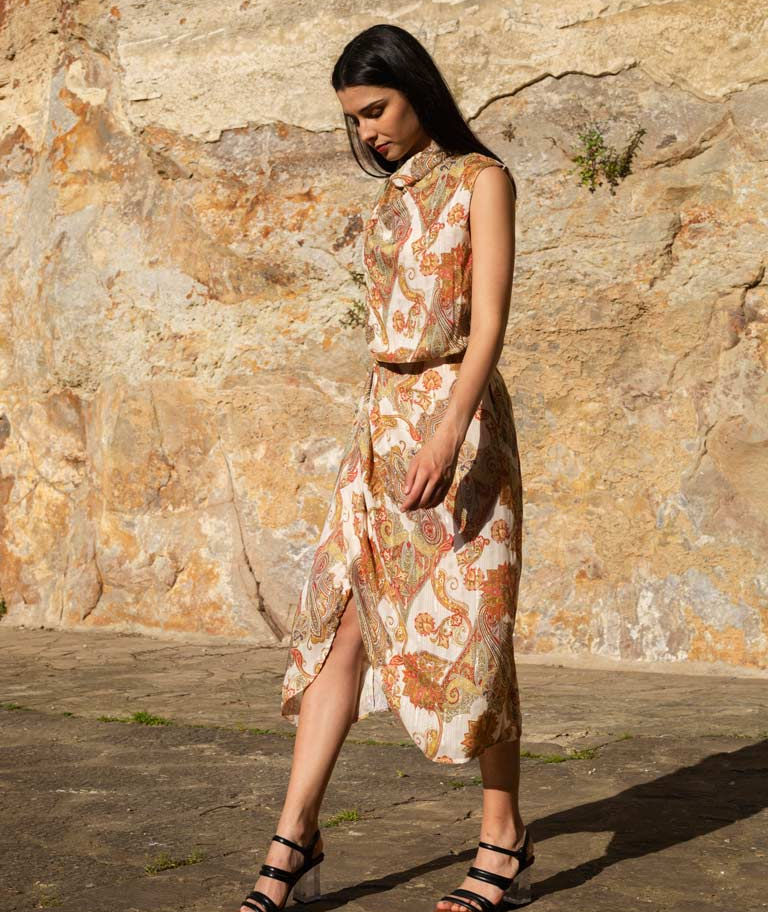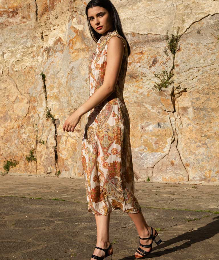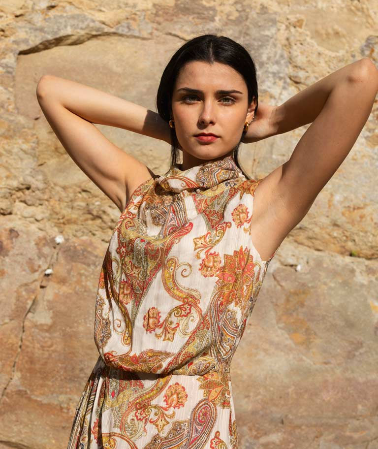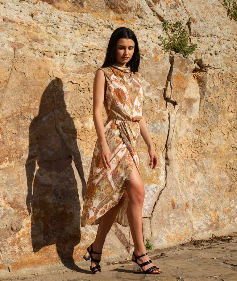 El vestido perfecto para que triunfes en ese evento tan especial. Drapeado en tejido fluido con el estampado tendencia de la temporada, sus matices dorados se potencian con la luz del atardecer, una auténtica joya transformada en look.