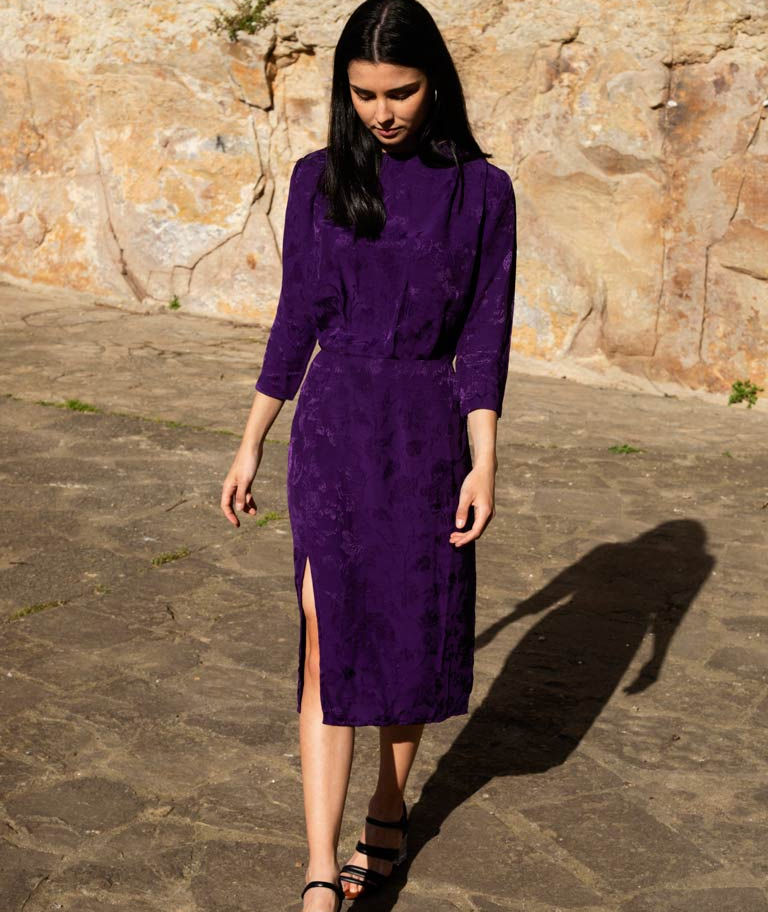 Vestido midi confeccionado en tejido de jacquard color morado. Tiene corte en la cintura y mangas tres cuartos. Cierra con cremallera invisible en la espalda.