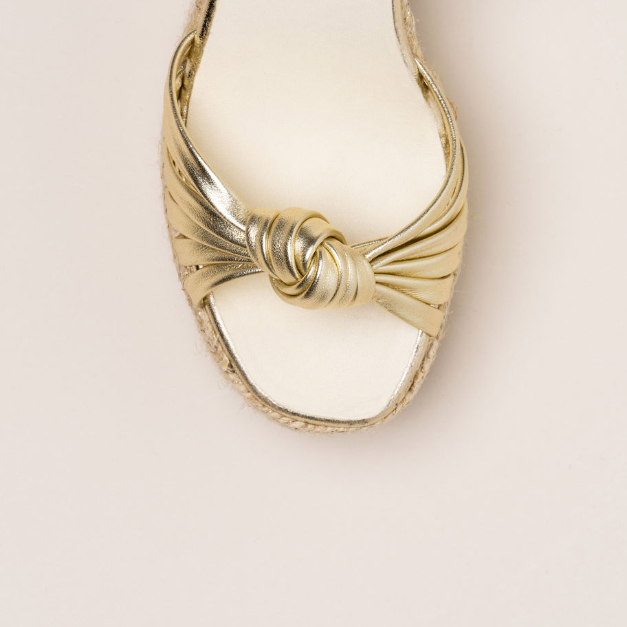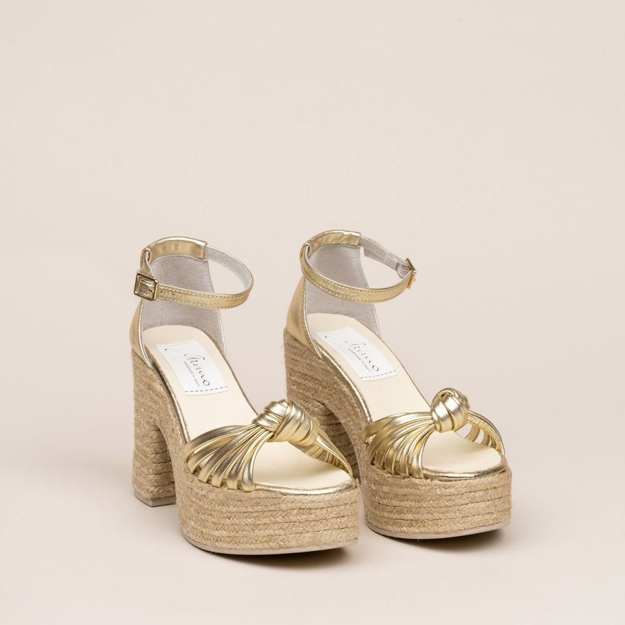 Alpargata de mujer en piel. Modelo Melissa con detalle de multi tiras entrelazadas en un nudo y talón cerrado con pulsera con hebilla al tobillo. Forro y plantillas acolchadas de piel con tacón ancho de yute ecológico de 10,5 cm de altura y plataforma de 3,5 cm. Diseñadas y fabricadas artesanalmente en España, son la elección perfecta para ganar de altura y darle a tu look un toque final llamativo y sofisticado sin perder la comodidad.