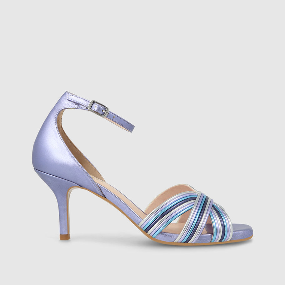 Sandalias de tacón de mujer JISENI de LODI en piel de color lila. Destacar tiras delantera en multicolor en tonos malva que aportan un toque de frescura y elegancia. Cierre mediante hebilla en tira al tobillo. Punta semicuadrada. Un diseño confeccionado con un tacón fino de 7.5 cm de altura. Incluye planta new gel para mayor comodidad en todas tus pisadas. Fabricado en España.